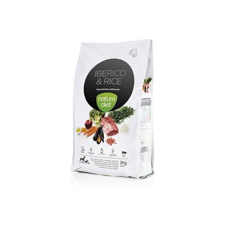 Natura Diet Iberico & Rice es un alimento completo natural y nutritivo, biológicamente adaptado para el disfrute de los perros adultos, sea cual sea su raza o tamaño. Está especialmente indicado para perros con sensibilidad digestiva o intolerancia a ciertos ingredientes.
